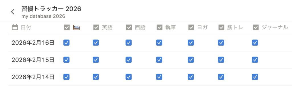 そこで、前述のTo Doリストとは別に作っているのが「シンプルな習慣化トラッカー」です。Notionのデータベースの項目をすべてチェックボックスにしただけの非常にシンプルなもの。
